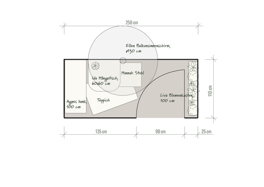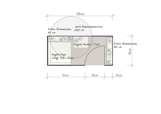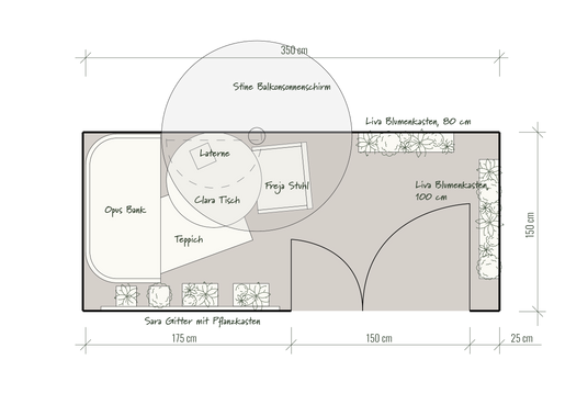 Ein Ellen Sonnenschirm spendet Schatten, während ein Balkonkasten mit Pflanzen für zusätzliche Gemütlichkeit auf dem Balkon sorgt.