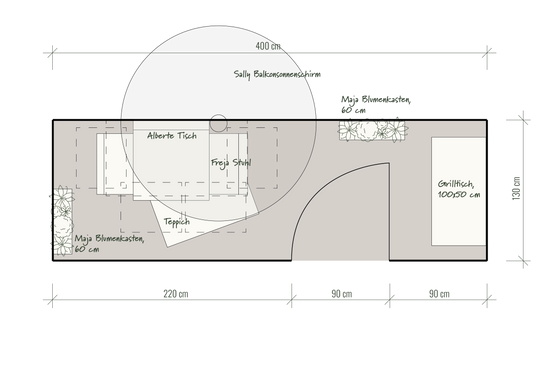 Ein Sally Sonnenschirm verleiht dem Balkon Charakter und sorgt an sonnigen Tagen für Schatten. Am Eingang des Balkons stehen ein Dora Grilltisch und ein Balkonkasten, in dem frische Kräuter für den Grill angebaut werden können.