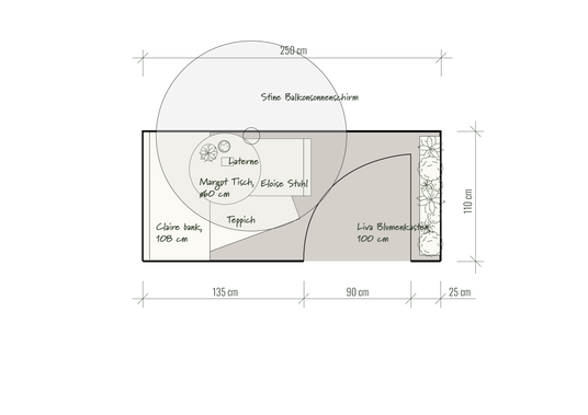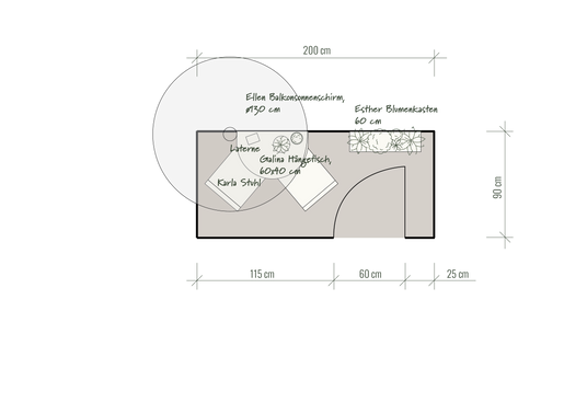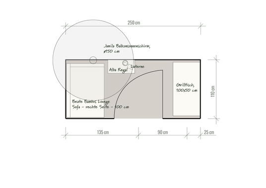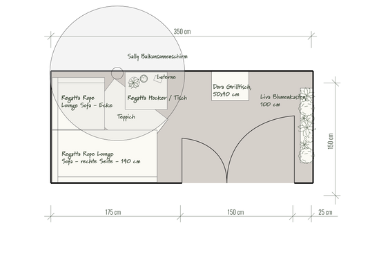 Um Bodenfläche zu sparen, wurde neben der Lounge eine Balkonablage angebracht, die als praktische Abstellfläche dient. Ein Sonnenschirm spendet Schatten und macht den Balkon an sonnigen Tagen angenehmer.