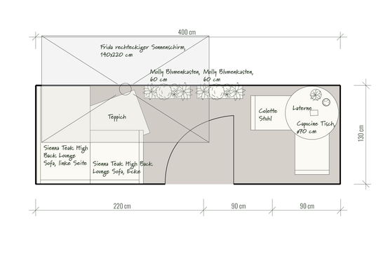 Die Einrichtung wird durch unseren größten Grilltisch ergänzt, der viel Arbeitsfläche zum Grillen und Kochen bietet – perfekt für Food-Liebhaber. Ein großer Sonnenschirm sorgt für Schatten, während Balkonkästen aus Teak Wärme, Farbe und grüne Pflanzen auf den Balkon bringen.