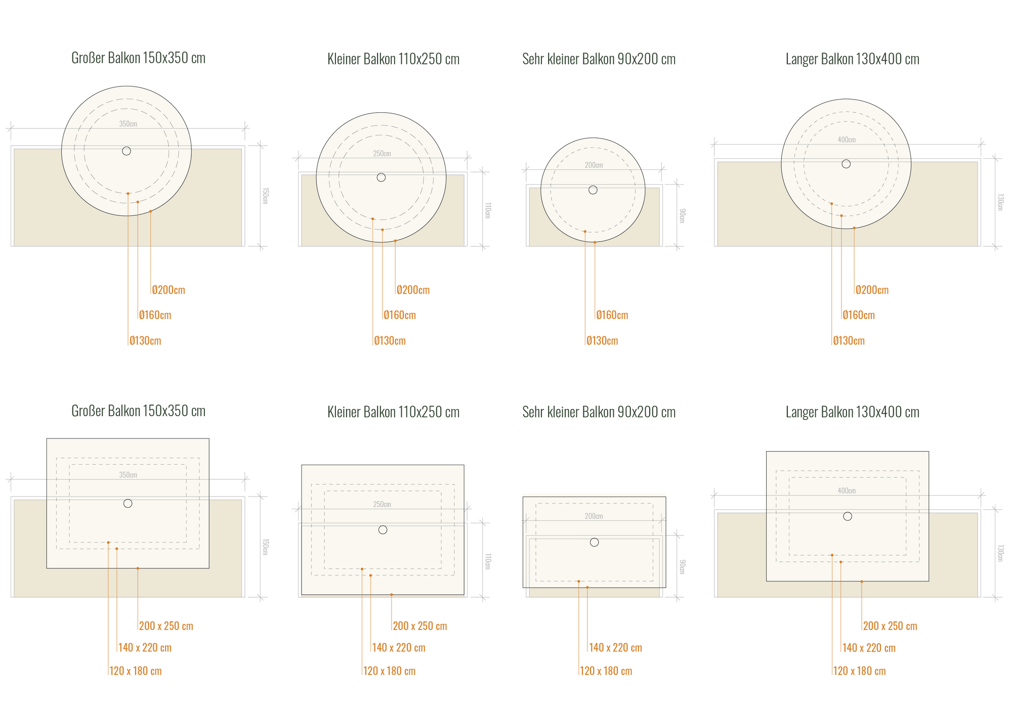 Deshalb haben wir eine visuelle Skizze erstellt, die zeigt, wie die verschiedenen Sonnenschirmgrößen zu Balkonen mit unterschiedlichen Längen und Tiefen passen.