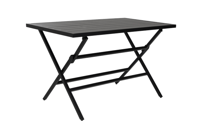 Wartungsfreier Tisch aus schwarzem Aluminium. Lässt sich bei Nichtgebrauch super einfach zusammenklappen und nimmt nur wenig Platz ein. Perfekt auf dem Balkon auch bei dem rauen skandinavischen Klima mit wechselnden Temperaturen. Sehen Sie hier die gesamte Wilkie-Serie.